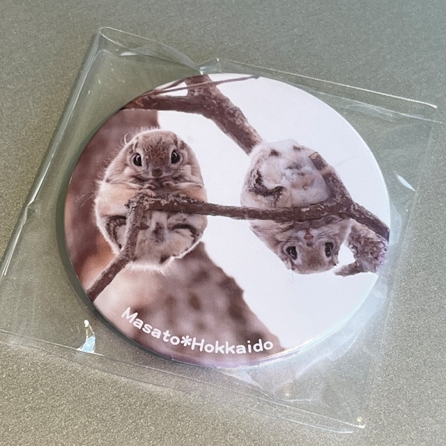 北海道の野生動物エゾモモンガの写真が描かれた 缶バッジ(新品)です。 数量限定品。 直径5.3センチほど